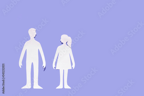 Silhouette of a woman and a man from white paper on a blue background. Flat lay, place for text.