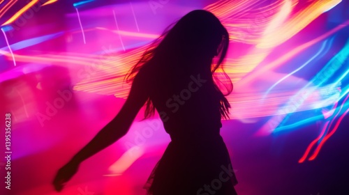 Silhouette of a woman dancing gracefully amidst vibrant neon lights, capturing the energy and movement of a lively night scene.