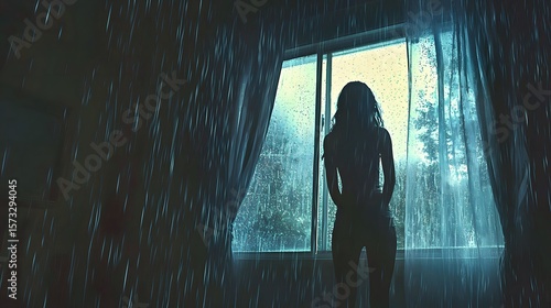 Silhouette of a woman in rain by a window, creating a contemplative mood.