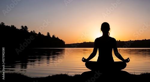 Silhouette of a woman meditating in lotus position by a calm lake at sunset, reflecting golden light.