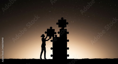 Silhouette of a woman placing a puzzle piece on a tower under starry sky.