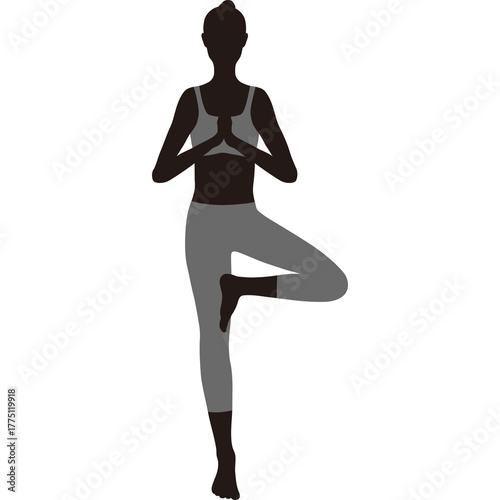 Silhouette of a woman practicing yoga tree pose in grey athletic wear with hands pressed together in prayer pose on a white transparent background demonstrating balance and wellness