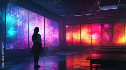 Silhouette of a Woman Standing in a Room with Colorful Glowing Panels.