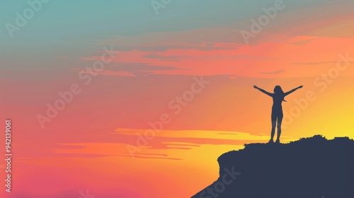 Silhouette of a Woman Standing on a Cliff with Her Arms Outstretched Against a Vibrant Sunset Sky