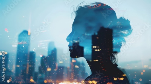 Silhouette of a woman with a city skyline superimposed over her face, symbolizing urban life and dreams.