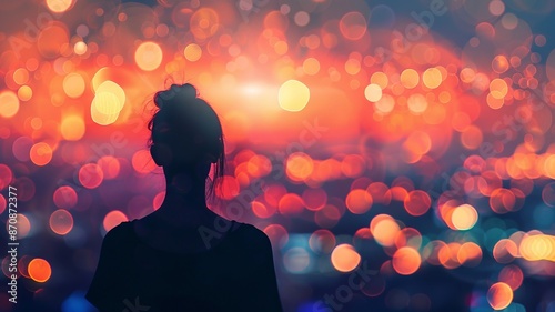 Silhouette of a Woman with Colorful Bokeh City Lights at Dusk