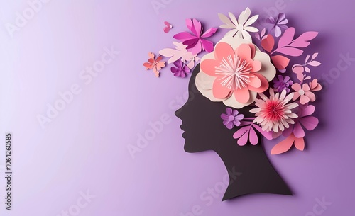 Silhouette of a woman's head with flowers cut from paper, against a purple background with pink and violet colors