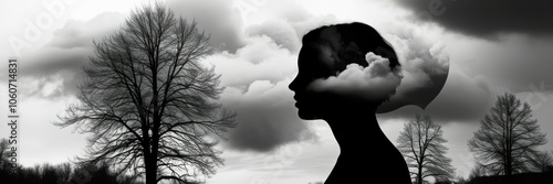 Silhouette of a woman's profile, bare tree silhouettes, dramatic cloudy sky, misty mountains, moody black and white landscape, surreal double exposure, ethereal atmosphere, dream-like composition, hau