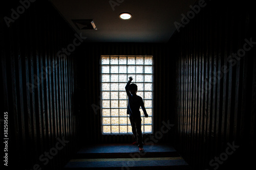Silhouette of a young boy having fun in a dark hallway.