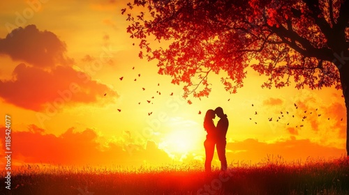 Silhouette of a young couple embracing at sunset under a tree, surrounded by flying butterflies.