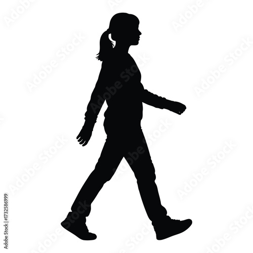 Silhouette of a young girl in motion walking confidently outdoors captured in high contrast silhouette