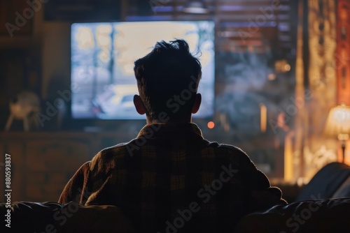 Silhouette of a young man relaxing on a sofa watching an exciting program on television