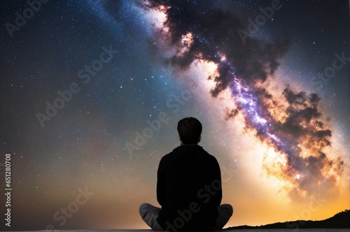 Silhouette of alone person looking at heaven. Lonely man standing in fantasy landscape with shining cloudy sky. Meditation and spiritual life