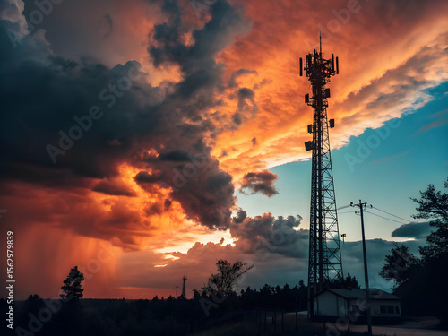 Silhouette of an abstract telecommunication tower antenna and satellite dish at sunset sky background