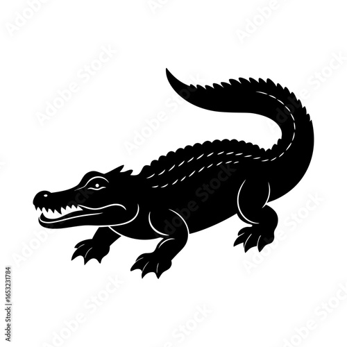 Silhouette of an alligator in black and white, showing its body, head, legs, and tail against a white background, perfect for educational or design projects