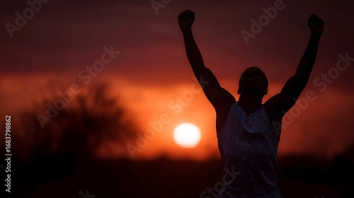 Silhouette of an athletic person with arms raised in triumphant celeb n against a vibrant fiery sunset sky