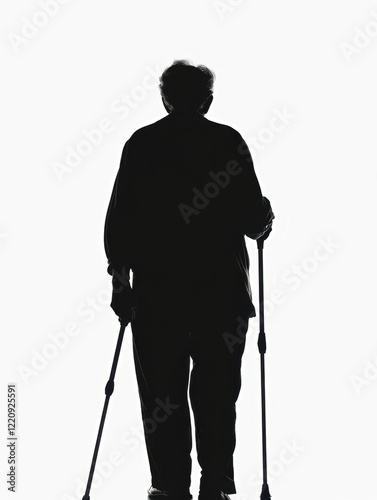 Silhouette of an Elderly Person Walking with Walking Sticks