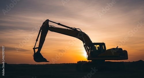 Silhouette of an excavator working at sunset, symbolizing construction and infrastructure progress