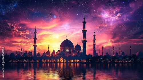 Silhouette of an ornate building reflecting in water under a colorful sky