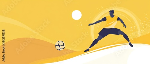 Silhouette of athletic man kicking soccer ball on yellow background Concept of sport, competition, and energy in vector illustration