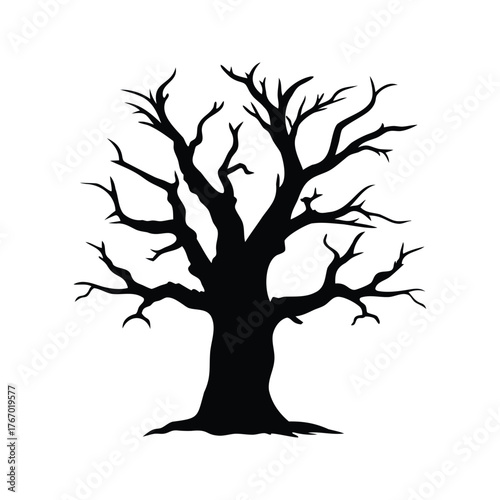 Silhouette of bare tree with outstretched branches against a white background, old broken dead tree silhouette vector illustration