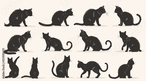 silhouette of black cat in different poses. A collection of artistic illustrations capturing various postures of a graceful feline