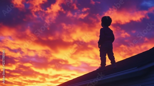 silhouette of child on roof at sunset