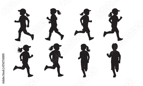 Silhouette of children running isolated on white background a group of kids in motion, showcasing childhood activity, fitness, and the joy of movement in a simple, graphic style