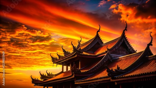 Silhouette of Chinese Temple in Thailand at Sunset - Dramatic Asian Architecture Stock Photo