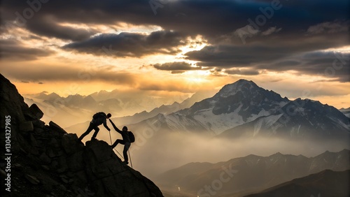 Silhouette of climbers helping each other, dramatic mountain sunset, golden rays breaking through clouds, misty peaks in background