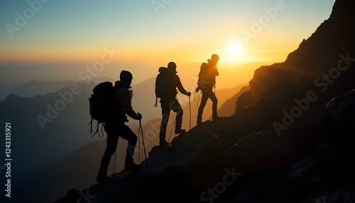 Silhouette of climbers who climbed to the top of the mountain thanks to mutual assistance and teamwork