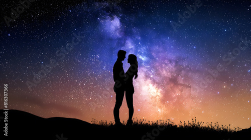 silhouette of couple with night scene milky way background in the galaxy : Generative AI