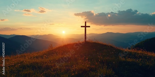 Silhouette of Cristian cross wood on top of hill at sunset , ai