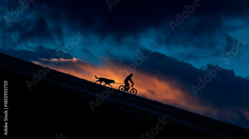 Silhouette of Cyclist and Dog Running at Sunset