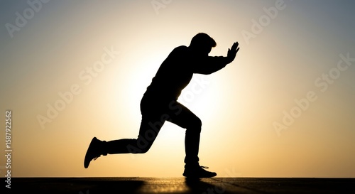 Silhouette of determined figure pushing against the illuminated sky gradient