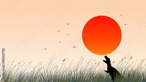 Silhouette of Dinosaur with Giant Sunset Over Tall Grass in Orange and Pink Sky