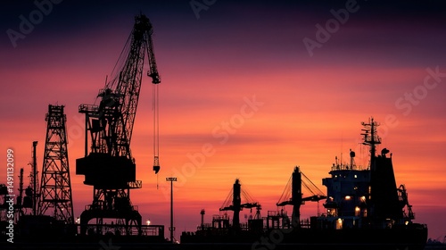 Silhouette of Dockyard Crane Blended with Cargo Ship at Sunset