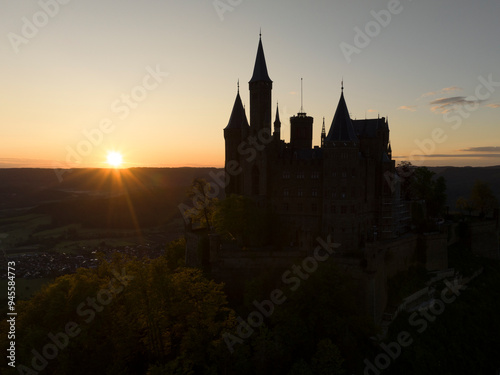 Silhouette of Famous Hohenzollern Castle at Golden Hour of Sunrise time, Baden-Wurttemberg, Germany. Aerial Drone Shot