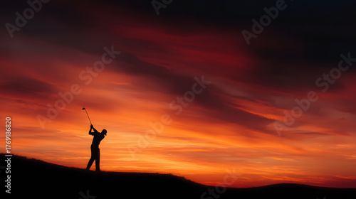 Silhouette of golfer swinging against dramatic sunset sky creates striking and serene scene. vibrant colors of sunset enhance peaceful atmosphere