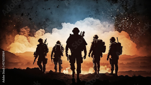 silhouette of group of soldiers with weapons against the background of sunset and explosions. Generative AI