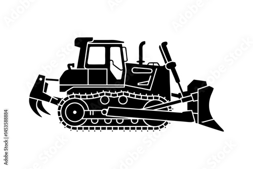 Silhouette of heavy construction bulldozer with blade and ripper in profile view