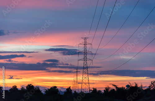 Silhouette of high voltage towers on the field and twilight. An image of high voltage towers and the sunset background.