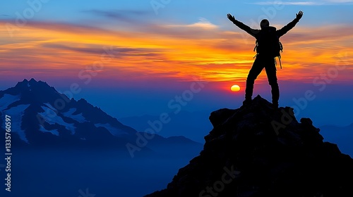 Silhouette of hiker celebrating sunset atop mountain peak.