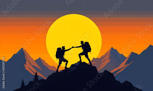 Silhouette of Hikers Helping Each Other Reach Mountain Top at Sunset