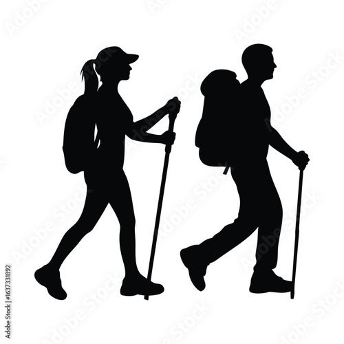 Silhouette of hikers trekking with backpacks and hiking poles outdoor adventure and recreation trip vacation