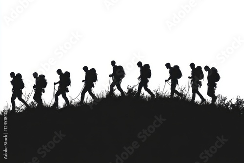 Silhouette of hikers walking in a line, carrying backpacks and trekking poles. Illustrates teamwork, adventure, and a journey towards a common goal.