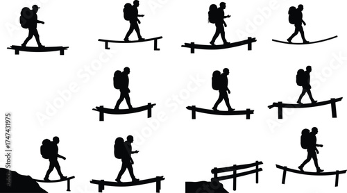 Silhouette of hikers walking on wooden bridge, outdoor trekking adventure, nature exploration, mountain hiking journey, travel and wilderness exploration illustration