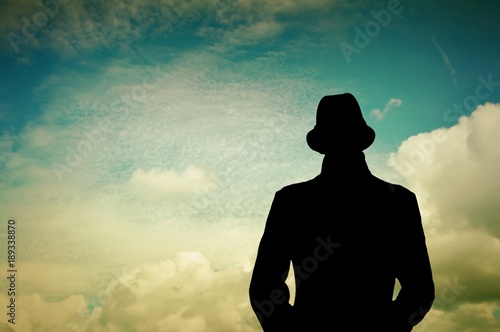 Silhouette of lonely man with hat looks at blue sky with clouds.