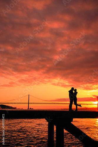 Silhouette of lovers kissing with a bridge in the background sunset time Lisbon