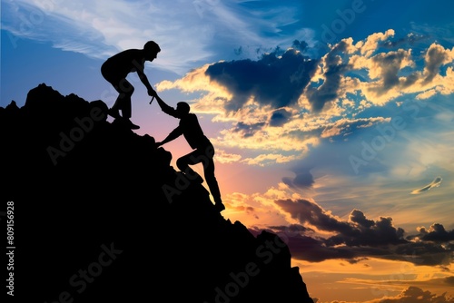 Silhouette of man helping friend to climb mountain, in the style of help concept Generative AI